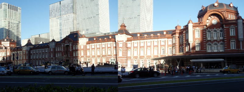 帰りに、今日グランドオープンしたばかりの東京駅丸の内駅舎に立ち寄った。テレビで紹介される映像は、駅舎に面したビルの4階辺りから撮っているので見事な景観だが、グランドレベルから見ると、前を走るバスや駅舎の前の通風塔などの邪魔物があって、なかなかグッドショットを撮るのが難しい。大勢のカメラマンたちに混じって何枚か撮ったものを継ぎ合わせた写真が下記。
