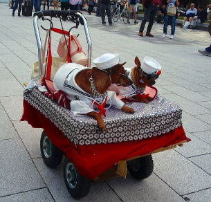 帰りにY女のリクエストで東京駅丸の内駅舎を見物した。快晴の土曜日とあって、カメラを手にした大勢の人でごった返していた。中には、大道芸人よろしく変わったパフォーマンスを御披露する御仁もいたが、その中でワンちゃんを乳母車に載せてこれ見よがしに散歩するお年寄りが興味を惹いた。そのワンちゃんというのが、ネイビールックの正装にサングラスまでかけて、2匹が仲良く見物客の前でポーズを取っていた(写真左がワンちゃん、右は駅舎をバックにY女)。