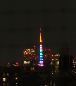 ところで、今日は東京タワーも変ったイルミネーションだ。クリスマス・バージョンなのだろう。本当はマンションの最上階に出て、非常階段から撮るときれいに撮れるのだが、寒いし、寝巻姿なので自室の窓から撮った。鳩除けのネットがぼんやり写っているのはその所為だ。手抜き写真で申し訳ない(右)。