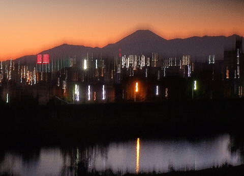 夕方、夕焼けの空に富士山が浮かび上がった。が、今日の写真は完全な失敗作。ベランダの側壁にカメラを抑えつけてシャッターを切ったが大きく縦方向にブレてしまった。照明の光はみっともないほどにブレているのだが、不思議なことに山の輪郭はクッキリ出ている。このアンバランスがチョット面白いかなと思って掲載することにした。