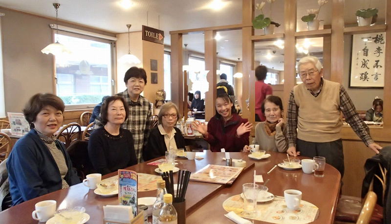 体調は万全とはいかなかったが、思いきって体操教室に出席した。かなりきつかったが、何とか1時間半のワン・クールを無事終えた。教室の後は女子会。新しいメンバーは未だ馴染みがないのか4人が欠席、結局古いメンバー7人が「バーミヤン」に集まった。この時の写真を撮るのが私の役目みたいなもの。下がスウィーツとコーヒーでお喋りした後で撮った写真。7人全員が写っているが、この写真は他の誰かに頼んだわけではなく、またセルフタイマーを使ったわけでもない。さて、どういう細工をしたのかお分かりいただけるだろうか。
