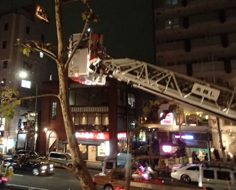 食事が進んで、牡蠣フライ、鳥の照り焼きと美味しく頂戴しているところでハプニング。突然、サイレンの音とともに消防車がやってきて、数人の消防士が店内に入って来たのだ。何でも、このマンションか隣りのマンションで出火があったという。そういえば、先ほどから少し焦げくさい臭いが漂っていた。消防士は店内を隈なく点検し、出荷の有無を調べていた。そうこうするうちに何台もの消防車がやって来た。窓から観ると、梯子車から梯子が伸びて高層階をチェックしている模様。