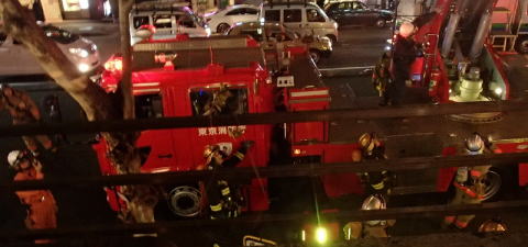 一時は店内騒然となったが、店の人が「この店は安全です。出火は隣りのマンションらしい」と説明して落ち着いた。その後も外は騒がしかったが、なかなか美味なディナーであった。お勘定だが、料理は@6,000円で、3人がかなり飲んだので、5人で4万6千円。3時間半、ゆっくり楽しむことができたので、まあそんなものだろう。何たって広尾だから…。下は消防車と梯子車。