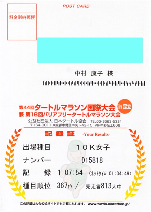 アウトドアは大の苦手のはずの4女康子が勤務先の目白で開催の「目白ロードレース」の5㎞レースに参加した。コースは学習院構内の急な坂道を含むが、29分台で完走。33人中13位という上出来の成績。尚、康子は10月にも足立区で行われた10㎞マラソンに挑戦して、1時間4分台という予想以上の成績で完走した(→
