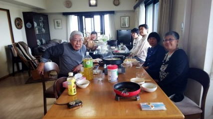 更に、千葉の麻子一家(ナオくんは大学入学式で欠席)も加わって、総勢7名で法事のスタート。仏前に私がお勤めして、般若心経を全員で朗読する。その後、各人が焼香して法事はおしまい。リビングに移ってすき焼きパーティーとなる。リビングのテーブルを横につないですき焼き鍋を2つセット。塩分警戒の千草は別鍋で自分で作る。