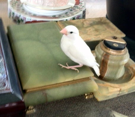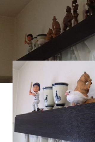 肩から降ろそうと、餌の入った給餌器のスポイドを口元に持っていった。すると、また飛び立って今度はカーテンレールの上の狭い飾りスペースの上に飛び上がった。ここには、飾り棚に入れるほどの価値はない装飾品を並べてある。我が家では「マイナーリーグの棚」と呼んでいる(左)。