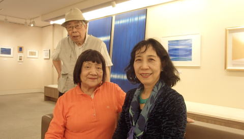 簡単に近況を報告しあって、作品を鑑賞させていただいた。入り口に小品を展示して、正面に大作「無限の刻」(左の写真・背景に見える青の作品)が展示されている。今回の展覧会の目玉作品だ。堀本さんの作品は、哲学的に言えば「形而上の作品」が殆ど。何しろ、宇宙における人間の魂をイメージした画だ。