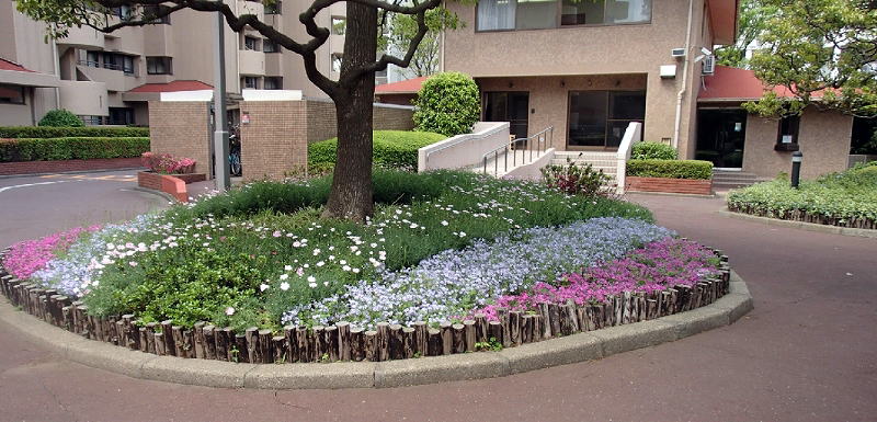 暖かい日が続く。マンション庭の花々もたくさん開花してきた。左はマンション庭で一番大きな欅の根元に作られた花壇。昨年まではムスカリだか、ラベンダーだか、紫色の花が咲く草がボウボウに植えてあった。年末に職人が入って植え替えていたものが花開いた。どこか街角の小公園のようだが、こちらの方が華やかで楽しい。