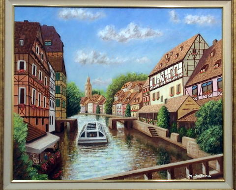 岡村氏とは以前それほど交流はなく顔と名前が分かる程度だが、有泉氏は宣伝に居たときから、CJC(Clean Japan Center)に出向してからもかなり交流があった。何年振りかで会ったが、かなり老けた感じに見えた。その喫茶店で1時間ほど喋った後、仲野画伯の画を拝見した。彼の画のテーマはほとんどがヨーロッパの風景。今度の画(左)もフランスのアルザス地方の風景。また、仲野氏の画は必ずと言っていいほど遠近法が取り入れてあり、それが、画面に奥行きをもたせている。
