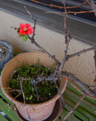このブログの2月9日の日記に書いたが、何時もは4月に開花するベランダの木瓜(ボケ)の鉢植えが一輪だけ花を咲かせた。開花した当時は、朝夕の冷え込みに早とちりを後悔している様子だったが、今は違う。枯れ木に唯一花開いた自分の姿を、未だ小さな小さなツボミの状態の他の仲間に誇示しながら、自慢しているようだ。