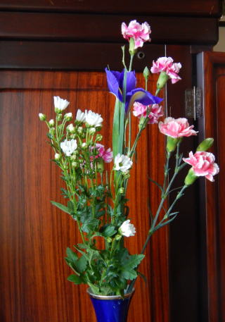 右上の仏花(2021-w5)は、イリスを主役に、小菊とスプレーカーネーションを脇役に置いてみた。