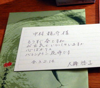 バレンタインの贈り物もドッサリ。一つずつ包んだもの(左)や出席者とは別に、今日、郵便で届いたものもある。O女からの「バレンタイン昆布」は「面白いオバサンだね」という評価を得た。