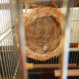 先ずは、昨日のニュースから。先般、猶井小鳥店から「ツボ巣を付けてやった方がいいかも」という趣旨のメールをを貰って、23日にやってきた淳子と一緒に、鳥篭にツボ巣を取り付けた。朝、覗いてみたところ、巣の中に卵が1ケ。NO.43だ。