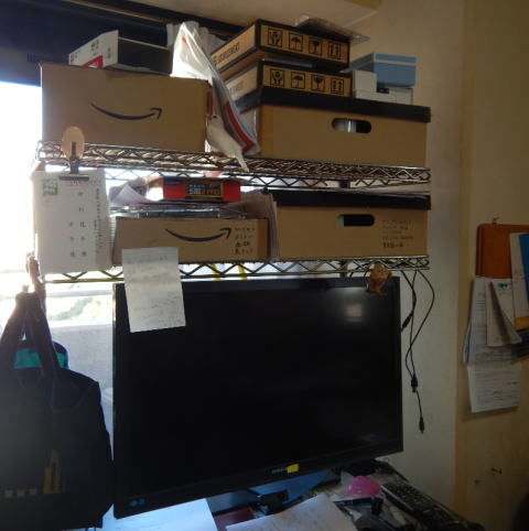机の上にはプリンターのインクやUSB, 接続コードなどの入った段ボール箱が積んであるのだが、よ~く見ると、段ボール箱とマニュアルの隙間で息をひそめるようにジッとしているケンゾーを