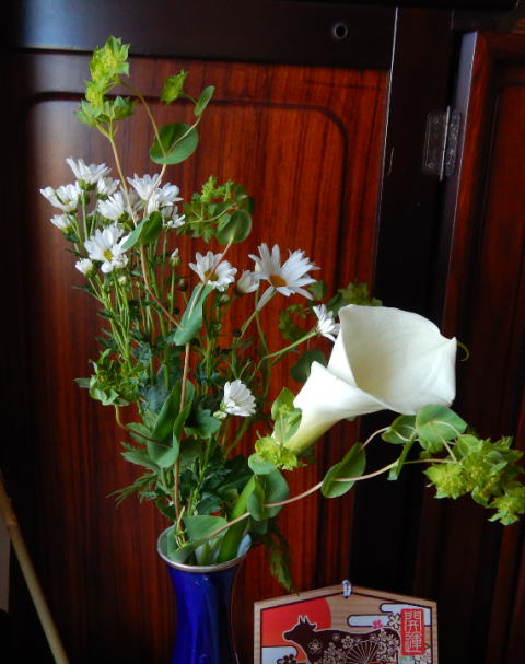 下の仏花は 2021‐w6。白をベースに、カラ、ガーベラ、小菊でアレンジしてみた。黄色のアクセントを付けようと、ミモザの花を挿したのだが、未だ開花せず、正に白主体の仏花の色調になった。